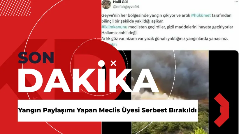 Sakarya’nın Geyve ilçesinde 20 Temmuz’da başlayan ve Bilecik’e sıçrayan orman yangınları devam ederken, sosyal medyada yaptığı paylaşım nedeniyle gözaltına alınan Geyve Belediyesi’nin Yeniden Refah Partili Meclis Üyesi Halil Gül, adli kontrol şartıyla serbest bırakıldı.