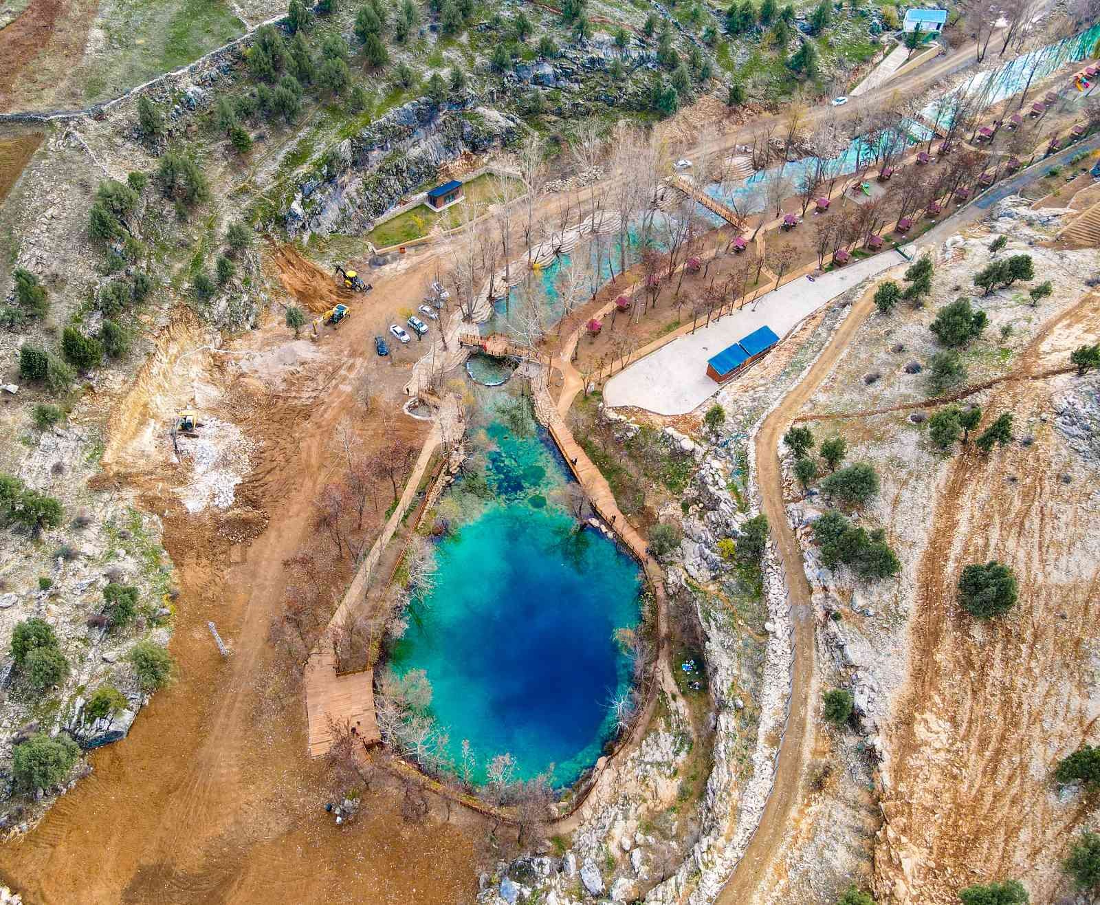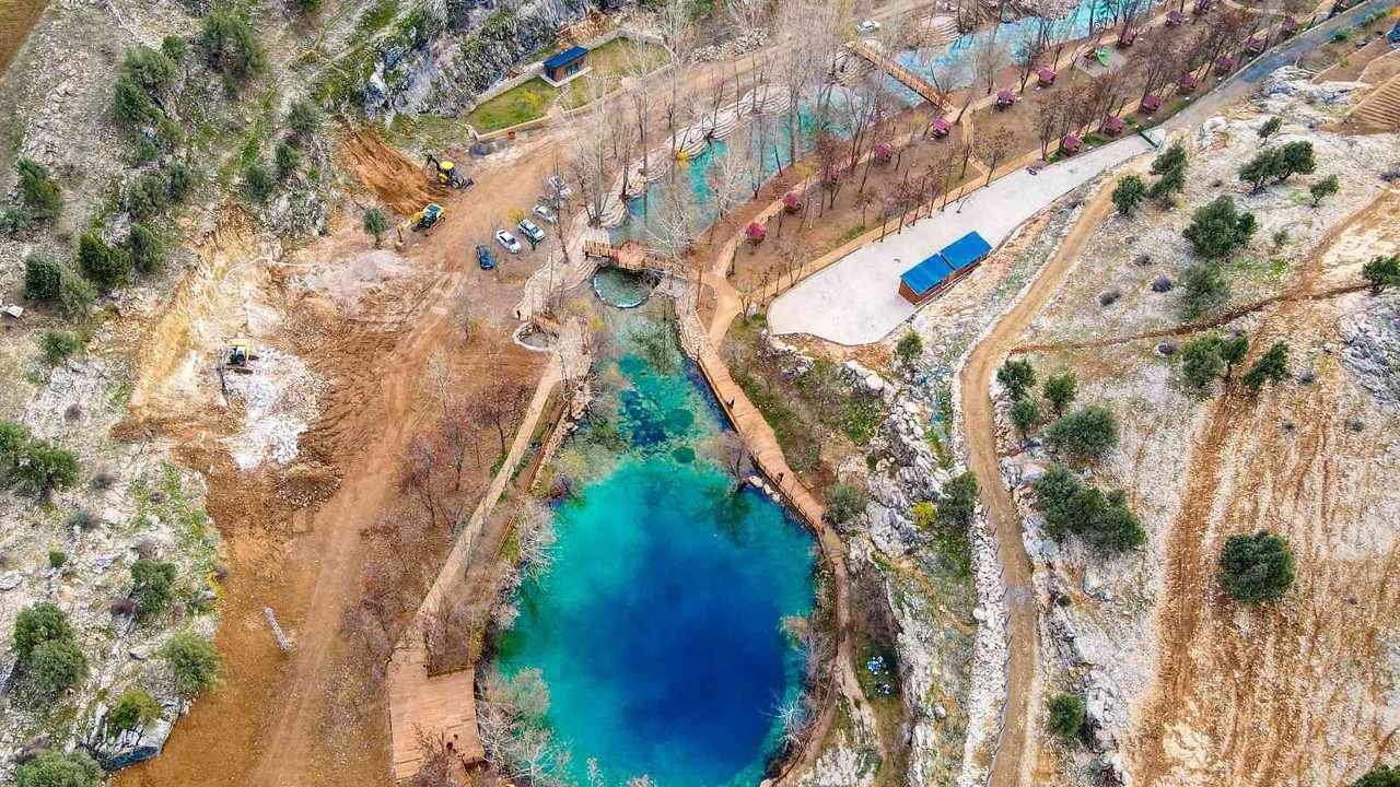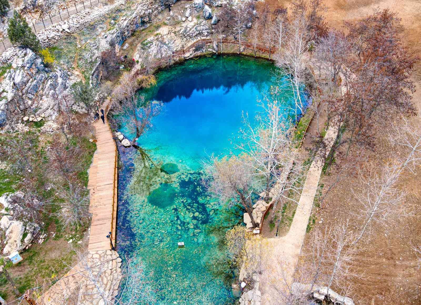 Kahramanmaraş’ta hem kaynağı hem de suyunun rengi nedeniyle dikkat çeken Yeşilgöz Mesire Alanı, yaz kış kartpostallık manzaralar sunuyor.